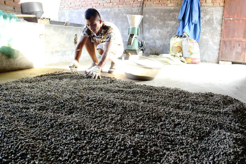 (李剛在一間飼料加工房內(nèi)晾曬自己加工的綠色生態(tài)飼料)