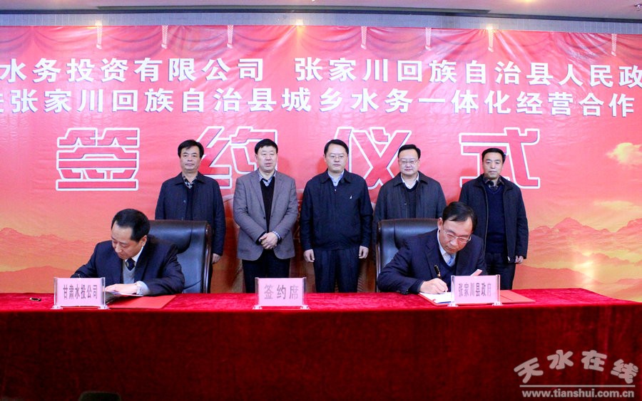 12月19日,張家川回族自治縣人民政府與甘肅省水務投資有限責任公司舉行推進張家川城鄉(xiāng)水務一體化經(jīng)營合作簽約儀式。省水利廳黨組副書記、副廳長楊成有,省水投公司董事長徐崇鋒,總經(jīng)理霍子俊,省水利廳規(guī)劃計劃處副處長曾有孝,市政府副市長許強,市水務局局長薄海明,市城鄉(xiāng)供水管理局局長王想明以及省市水投公司相關負責人和縣領導劉長江、馬中奇、李國恩出席簽約儀式?h直有關部門和各鄉(xiāng)鎮(zhèn)負責人參加?h委副書記妥國保主持簽約儀式。
