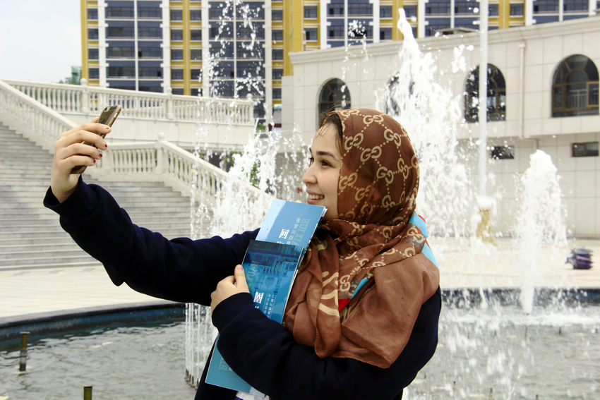 一位東干族留學(xué)生在張家川縣回鄉(xiāng)風(fēng)情園內(nèi)自拍