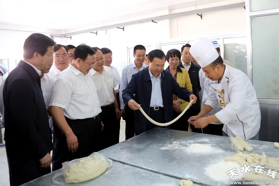 (圖為省委書記、省人大常委會主任王三運(yùn)調(diào)研張家川縣扶貧工作時親身體驗(yàn)“拉面”技術(shù))