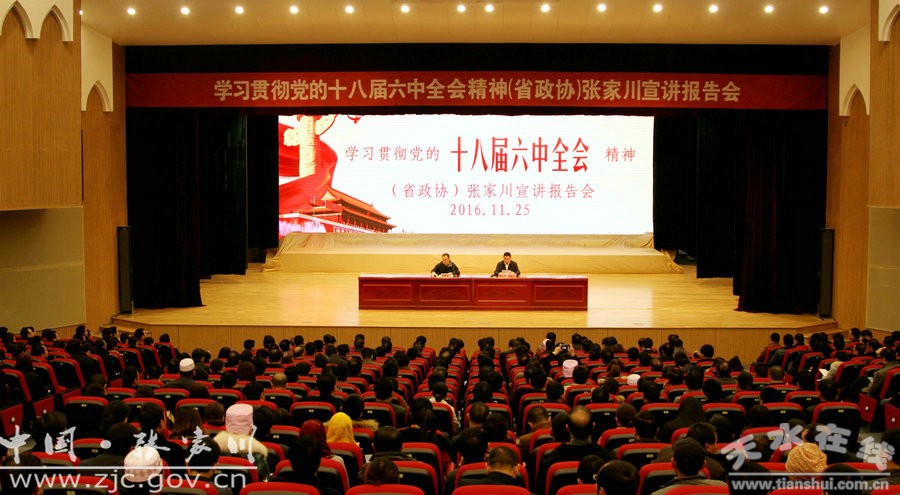 為了幫助基層廣大黨員干部群眾全面、深入地學(xué)習(xí)黨的十八屆六中全會(huì)精神,更好地把思想和行動(dòng)統(tǒng)一到六中全會(huì)精神上來,11月25日上午,省政協(xié)在張家川回族自治縣開展黨的十八屆六中全會(huì)精神宣講活動(dòng)。省政協(xié)外事委主任黃周會(huì)作專題輔導(dǎo)報(bào)告?h委書記陳晰主持報(bào)告會(huì)。