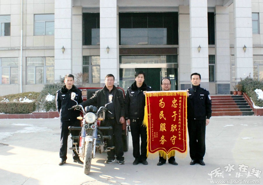 “感謝你們幫助我找回摩托車!2月25日,市民馬西其歡天喜地的開著失而復(fù)得的三輪摩托趕到了張家川縣公安局,將一面“為民服務(wù)、忠于職守”的鮮紅錦旗送到民警手里,當(dāng)面感謝民警幫忙找回丟失的三輪摩托車。