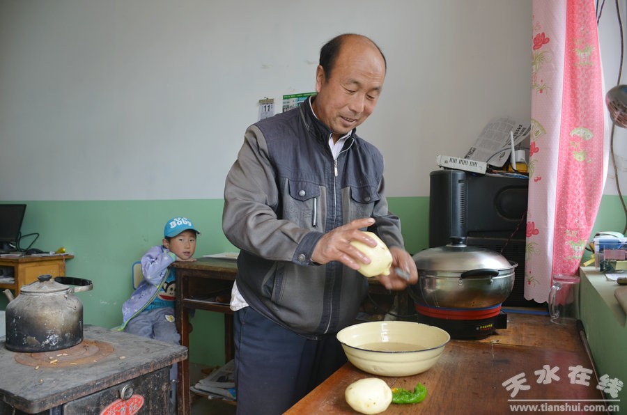 中午,蔣老師做飯。為了照顧孫子,孫子跟他在學校上學。