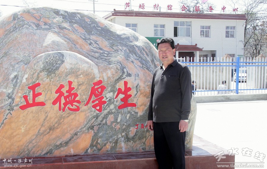 (蘆塬村文化廣場(chǎng)上的一塊石頭刻著正德厚生四個(gè)字,品味其中的意思,成了孫志明日常生活中的一道功課)