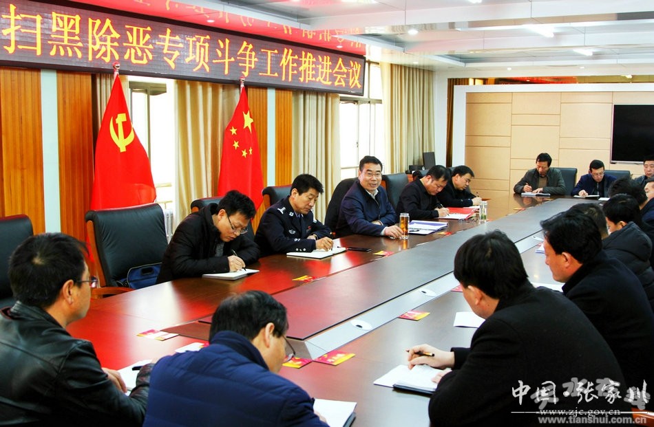 2月15日,張家川縣委書(shū)記、縣掃黑除惡專(zhuān)項(xiàng)斗爭(zhēng)領(lǐng)導(dǎo)小組組長(zhǎng)陳晰主持召開(kāi)全縣掃黑除惡專(zhuān)項(xiàng)斗爭(zhēng)工作推進(jìn)會(huì),傳達(dá)全市掃黑除惡專(zhuān)項(xiàng)斗爭(zhēng)約談暨工作部署會(huì)議精神,通報(bào)掃黑除惡專(zhuān)項(xiàng)斗爭(zhēng)進(jìn)展情況,并對(duì)當(dāng)前和今后一個(gè)時(shí)期掃黑除惡專(zhuān)項(xiàng)斗爭(zhēng)進(jìn)行安排部署?h領(lǐng)導(dǎo)高建平、劉正順及縣掃黑除惡專(zhuān)項(xiàng)斗爭(zhēng)領(lǐng)導(dǎo)小組成員單位主要負(fù)責(zé)人,15鄉(xiāng)鎮(zhèn)黨委書(shū)記參加會(huì)議。