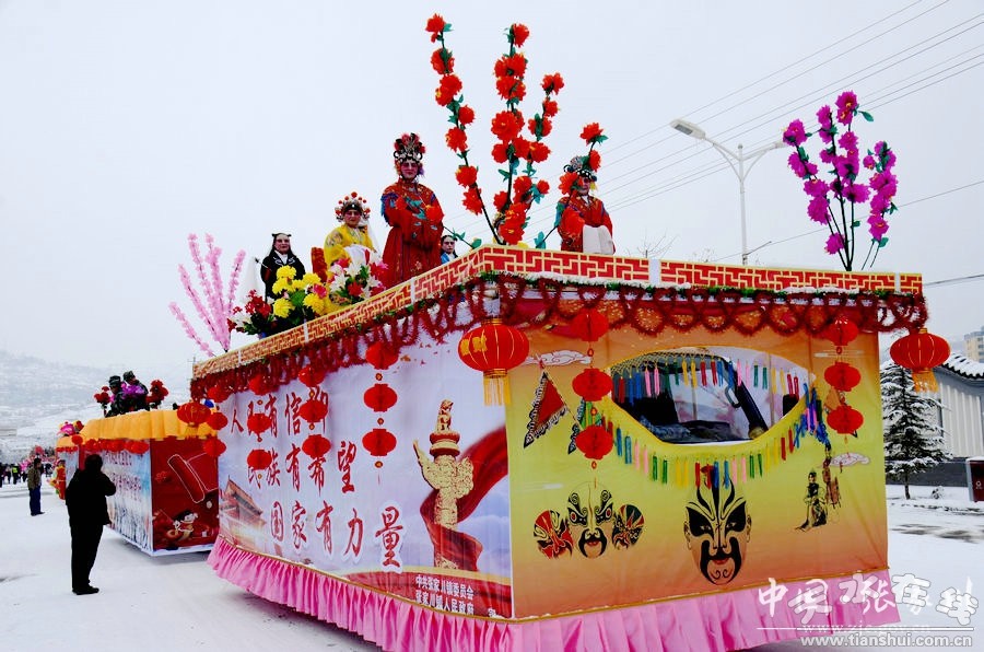 高臺(tái)、高蹺、舞獅、彩車、武術(shù)、秧歌等傳統(tǒng)社火節(jié)目競(jìng)相表演,所到之處歡歌笑語(yǔ),掌聲不斷,喝彩不斷,精彩地表演把紅紅火火的年味推向了一個(gè)新的高潮,為廣大群眾送上了新春的美好祝福,也向回漢群眾傳播著中華民族最悠久的民間傳統(tǒng)文化和現(xiàn)代文明,無(wú)不流露著群眾對(duì)中華民族偉大復(fù)興的中國(guó)夢(mèng)的美好向往和全面建成小康社會(huì)的自信。社火表演提振了張家川34萬(wàn)回漢人民脫貧攻堅(jiān)的精氣神。