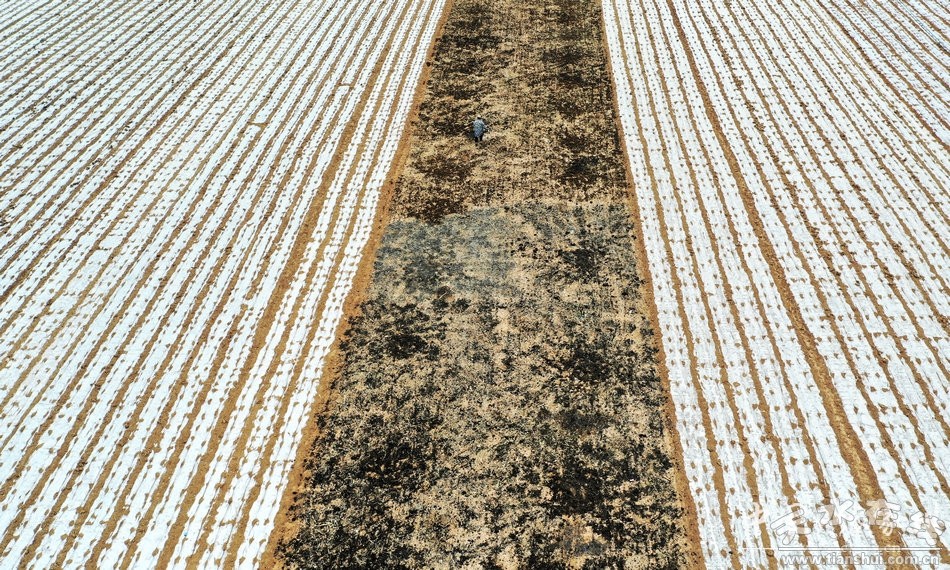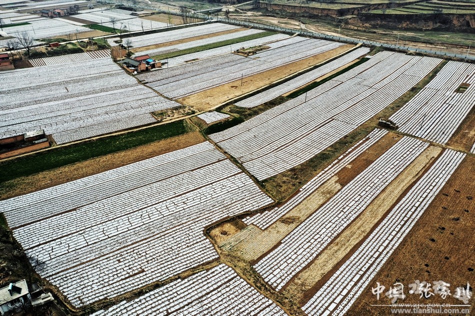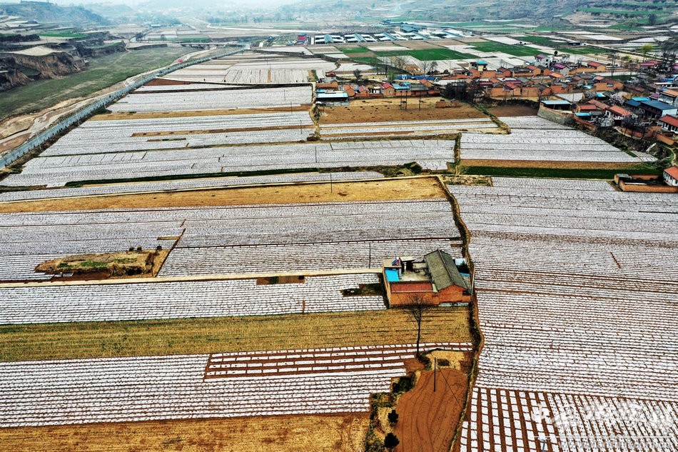 在龍山鎮(zhèn)鄭家村的田地里,轟鳴作響的旋耕機(jī)、覆膜機(jī)穿梭于田間地頭,一塊塊平整的土地猶如穿上了靚麗的銀裝,從空中俯瞰,覆膜田地與麥田、民居、公路、山川河流交相輝映,構(gòu)成一幅美麗的山鄉(xiāng)春耕圖。
