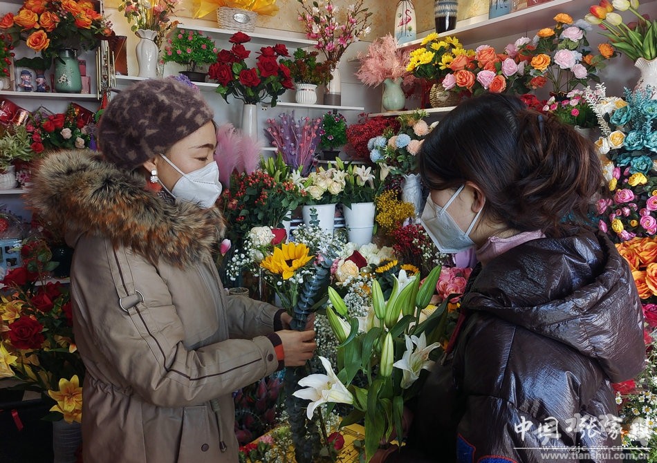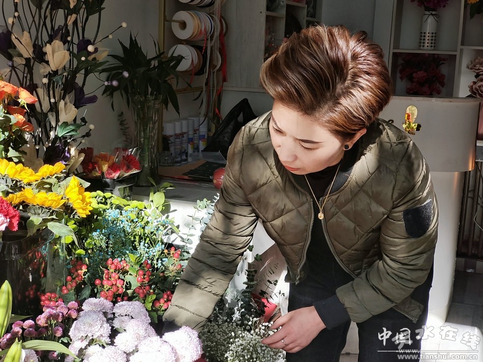 先花店店主馬小燕一邊忙著向顧客推介新品,一邊說:“我在張家川開鮮花店已經(jīng)七年了,隨著人們生活水平的提高,人們的消費觀念也變了,越來越注重儀式感。這七年我店里的生意是越來越好,遇上七夕節(jié)、三八節(jié)、母親節(jié)、父親節(jié)等節(jié)日,我們通常都要熬三四個通宵修剪和包裝。元旦快到了,店里為大家準備了品種多樣的鮮花,這兩天顧客都來購買各式花卉,給新年增添喜慶的色彩!