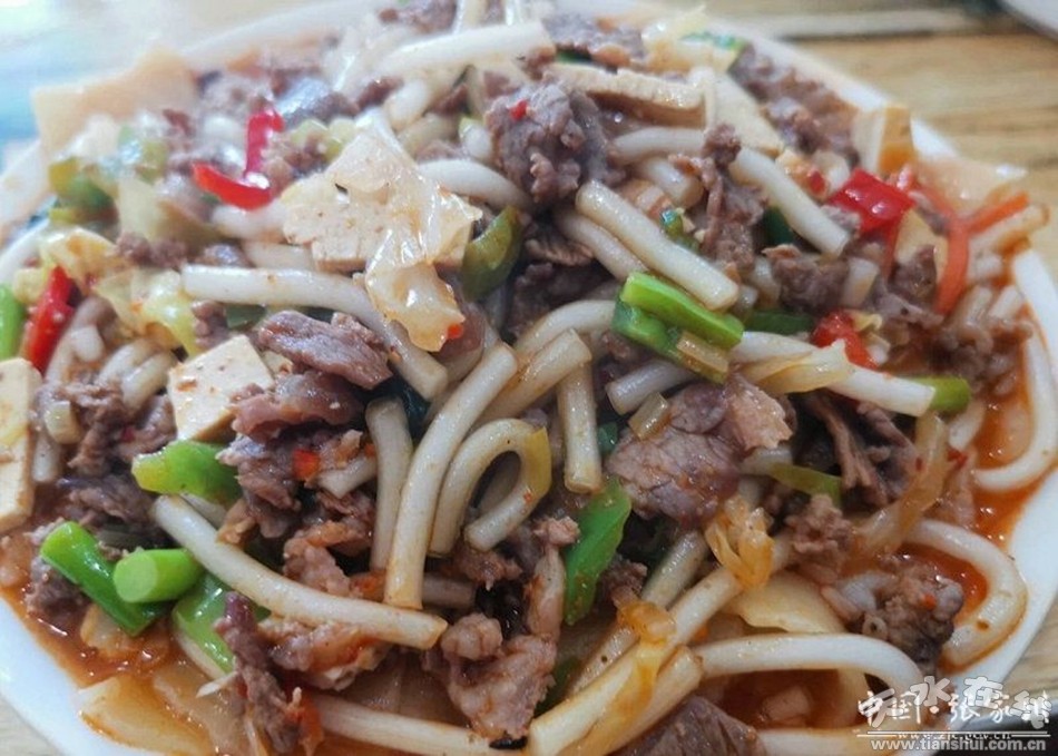 張家川炒面片好吃是有道理的。堿水和少許鹽和面,將面和成軟面團(tuán),揪成一個(gè)個(gè)小面劑子,抹上一層油,放面盆里醒著。面睡著之時(shí),準(zhǔn)備炒菜。牛肉切成薄片,蔥切絲,與泡好的粉條一起炒成臊子。燒開水將醒好的面揪成面片下鍋里煮,一個(gè)面劑子就是一條面,煮熟的面片用笊籬撈出放冷水里浸一下,瀝干水待用。洋蔥,西紅柿、青菜、豆腐下熱鍋爆炒出香味,倒入面片繼續(xù)爆炒,然后加入食鹽,胡椒面、味精、醋,炒至入味就可關(guān)火起鍋。把炒好的面盛在碗里,上面澆上事先炒好的肉和粉條臊子,一碗炒面就算做成了。