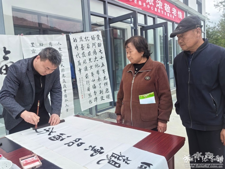 活動(dòng)現(xiàn)場(chǎng),書法愛好者揮毫潑墨,書寫著一個(gè)個(gè)蒼勁有力的“!弊趾凸P酣墨飽的字畫。筆力雄健,氣韻生動(dòng)的作品蘊(yùn)含著深深的祝福,承載著大家對(duì)長(zhǎng)者誠(chéng)摯的祝福與關(guān)愛。