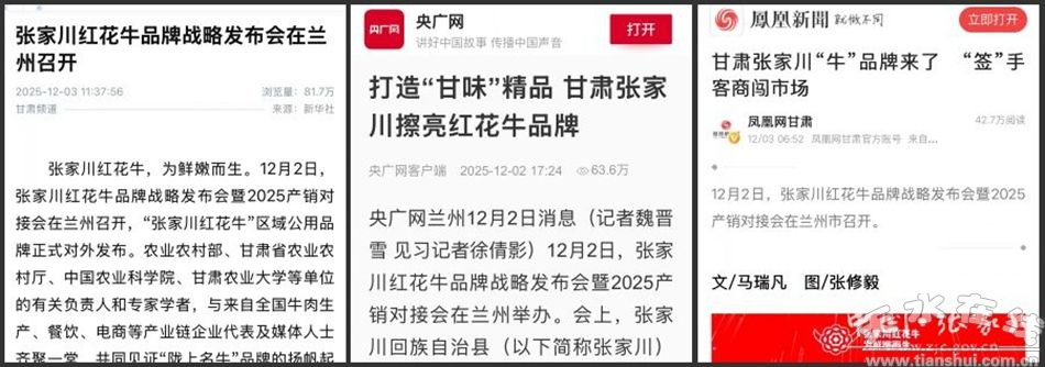 截至目前,新華社甘肅頻道、央廣網、央視頻、鳳凰網、甘肅日報、甘肅電視臺、甘肅農民報、甘肅經濟日報、天水融媒、天水在線和張家川融媒等中央、省市縣媒體已通過圖文、視頻等多種形式展開立體報道,相關話題持續(xù)引發(fā)社會關注。隨著媒體傳播的持續(xù)發(fā)酵,張家川紅花牛正以更鮮明的品牌形象、更優(yōu)質的產品口碑,走出甘肅、走向全國,讓更多人領略“隴上名!钡莫毺伧攘。