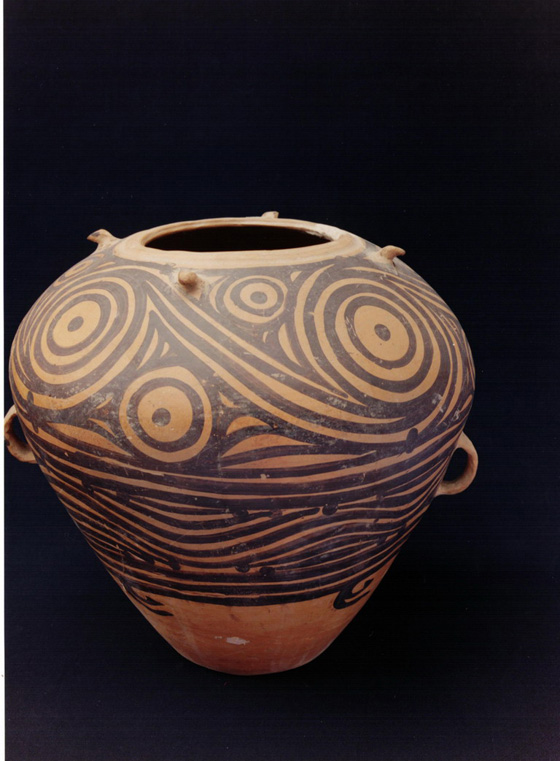 旋紋雙耳四板彩陶甕,馬家窯文化,口徑16厘米,底徑5厘米,高35.5厘米。