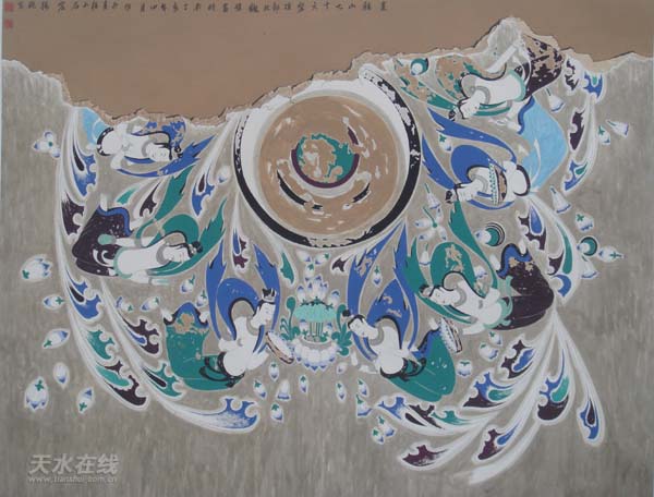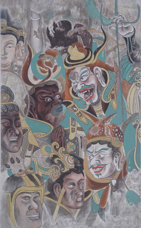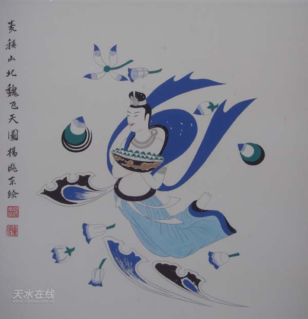 麥積山石窟除以石胎泥塑而享有“東方雕塑館”盛名外,窟龕內(nèi)壁畫以北魏作品為代表,其大型經(jīng)變畫、大型飛天組畫為眾專家驚嘆和折服。五十年代,著名藝術家、專家學者常書鴻、吳作人、段文杰等先后到麥積山對其現(xiàn)存壁畫進行過考察或臨摹,并認為其部分早期作品從年代、規(guī)模、藝術價值不亞于敦煌壁畫,其中127窟《西方凈土變》被眾多專家譽為該題材壁畫的中國之最。十多年來,楊曉東先生對現(xiàn)存的麥積山早期大型壁畫進行了潛心研究,全面整理和臨摹,共獨立完成壁畫臨品上百平米,為麥積山壁畫走出國門創(chuàng)造了條件。