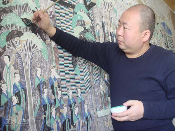 面壁十年,臨摹壁畫成品上百平米,既有原汁原味的壁畫臨品,同時,集壁畫原作現(xiàn)狀的各種美學元素于一爐,凝煉出許多體現(xiàn)作者自我的創(chuàng)作性系列壁畫上百幅,其流暢的線條、具有強烈感染力的色彩、極富親和力的人物神態(tài)、體態(tài),都將更集中、更深刻、更全面的體現(xiàn)著壁畫藝術的精神內(nèi)涵和時代旋律,面對今天的成果,他的內(nèi)心得到了安慰。