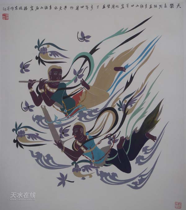 麥積山偉大的壁畫藝術更讓他如癡如醉。4號窟北周脫壁欲出、神采飛揚的大型飛天組畫,曾使他心曠神怡,127窟北魏大型經(jīng)變畫,更讓其愛慕有加,強烈的求知欲和表現(xiàn)欲推動他走完長達十三年臨摹壁畫之藝術歷程。