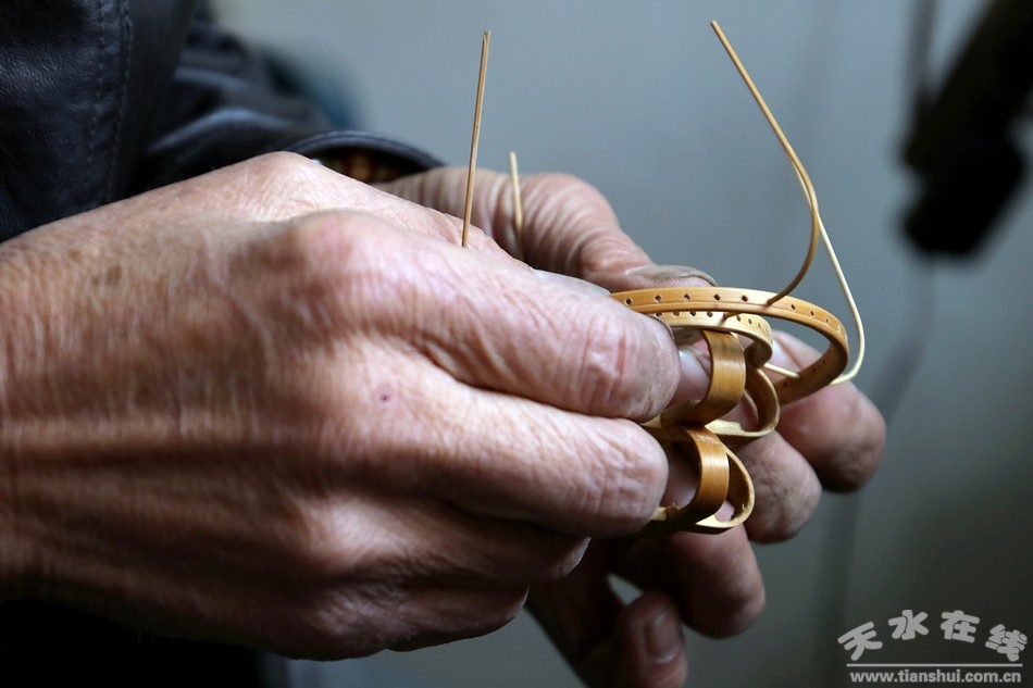 緊接著裴永祥老人拿出了幾根如牙簽般的細(xì)竹條,色澤黃潤(rùn),長(zhǎng)短一致!斑@些竹條先是用刀把竹皮切成每一小根,再用砂布揉搓至表面光滑,粗細(xì)均勻,切好這么一小把細(xì)竹條得花小半天功夫!甭犞嵊老槔先说脑,小編覺得這一個(gè)小小的螞蚱籠,每一道工序,每一個(gè)小部件可都是老人悉心勤作的心血。接下來只見老人把竹條穿進(jìn)剛打好孔的竹圈里,每個(gè)孔一根,竹圈和竹條就固定在了一起。同樣的再在中間部位固定一個(gè)竹圈,最后和地盤拼接起來,一個(gè)螞蚱籠的大致模樣就出來了!拔揖幍奈涷苹\每一部分都是用穿孔的方式拼接起來的,沒有一根釘子或借用其它工具,純手工制作!钡拇_,小編從頭到尾沒有見到一根類似釘子的工具,完全是老人用他那雙靈巧而又滄桑的手一點(diǎn)點(diǎn)細(xì)心編制出來的。
