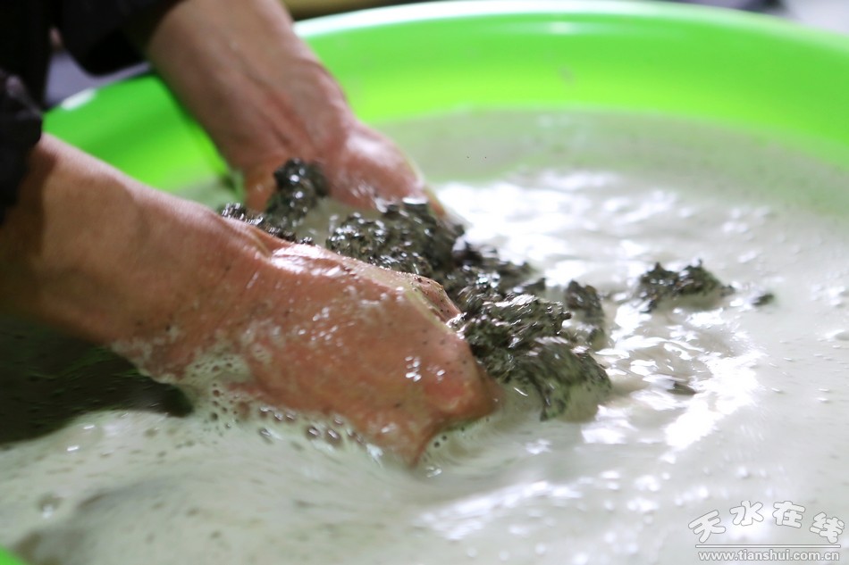 麻子磨碎后,高旺生熱情地吆喝我們跟他去房頂上煮麻腐。他邊上樓邊告訴小編,他們家磨的大多都是內(nèi)蒙古的麻子,顆粒飽滿(mǎn),個(gè)大瓤鮮,做出來(lái)的麻腐吃起來(lái)更有滋味!奥樽硬幌裥←溈梢栽趧兤C(jī)里去皮,它只能先在石磨上連皮帶仁的碾碎,再到水里手工挑揀麻子皮,每天光分篩雜質(zhì)就要花一兩個(gè)小時(shí)。”高旺生在作坊的桌臺(tái)上支起三個(gè)大盆子,里面盛滿(mǎn)熱水,倒入碾好的麻子開(kāi)始一遍一遍地淘仁。他的手慢慢的在盆子里攪動(dòng),一邊搓洗麻仁,一邊將漂浮在水面上的麻子皮挑揀出來(lái),反復(fù)三四次,終于將麻仁淘洗干凈。