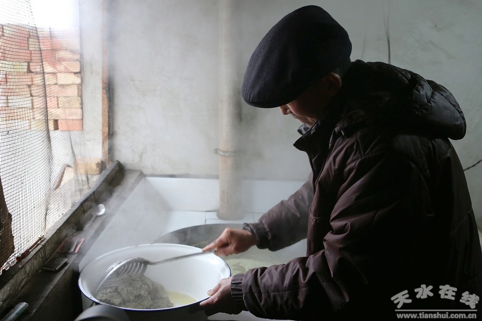 麻仁淘好后,就該煮麻腐了。高旺生在鍋上支起一個(gè)木架,將淘洗出來(lái)的一盆麻仁水倒入濾網(wǎng)進(jìn)行二次過(guò)濾!霸矍匕踩俗鰱|西,就講究個(gè)精細(xì),做麻腐一定要把麻子皮清洗干凈了,不然做出來(lái)的食物吃到嘴里扎舌頭,口感不細(xì)膩!备咄⌒囊硪淼耐鶠V網(wǎng)里面倒水,灰綠色的汁水通過(guò)濾網(wǎng),過(guò)濾至灶臺(tái)上的大鍋內(nèi)。濾網(wǎng)內(nèi)剩下的殘留物,是細(xì)小的麻子皮,過(guò)濾后的麻仁水,就可以燒鍋了。給灶里添上火,等到鍋里的湯汁慢慢沸騰,高旺生拿起勺子開(kāi)始緩緩的在缸里翻攪,幾圈下來(lái),湯汁里面的麻腐慢慢凝結(jié)在一起,滿(mǎn)屋都是一股麻子特有的醇香。“煮麻仁的制作工藝與點(diǎn)豆腐有些相像,成品又和豆腐質(zhì)地相似,所以我們就管這東西叫麻腐!贝蟾攀宸昼姾,高旺生將麻腐撈出,過(guò)濾出殘留的汁水,這麻腐就算是做好了。