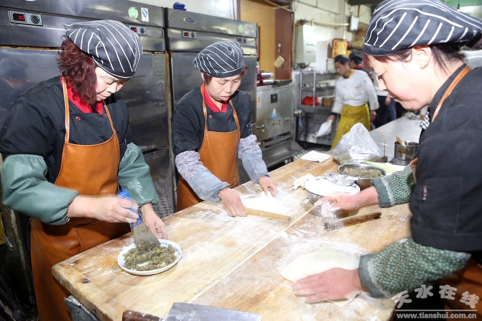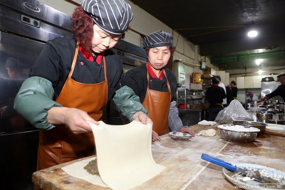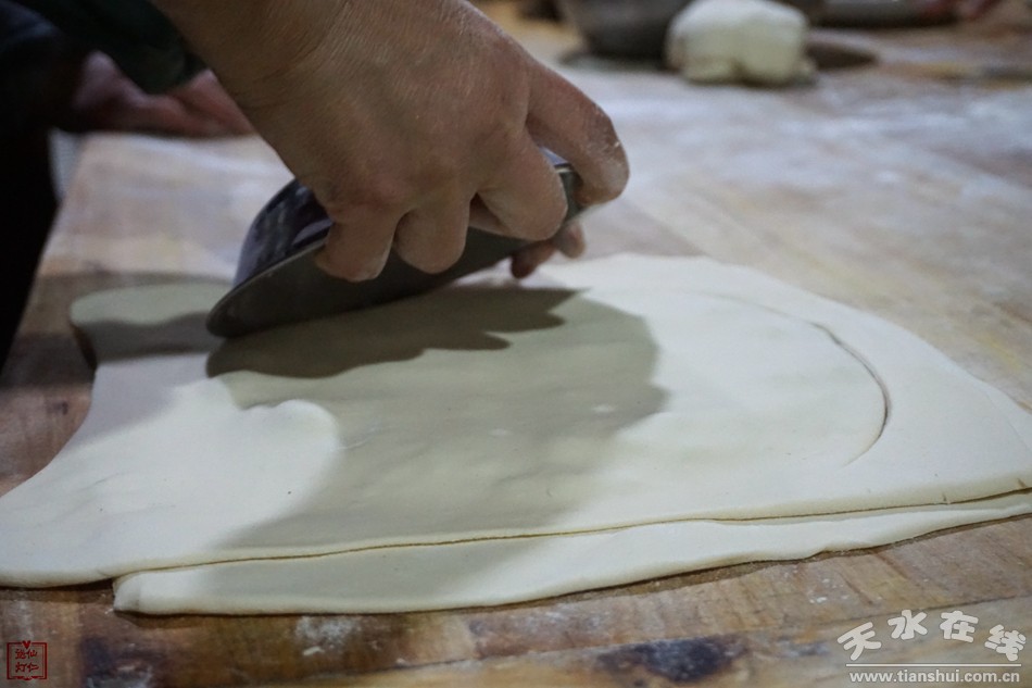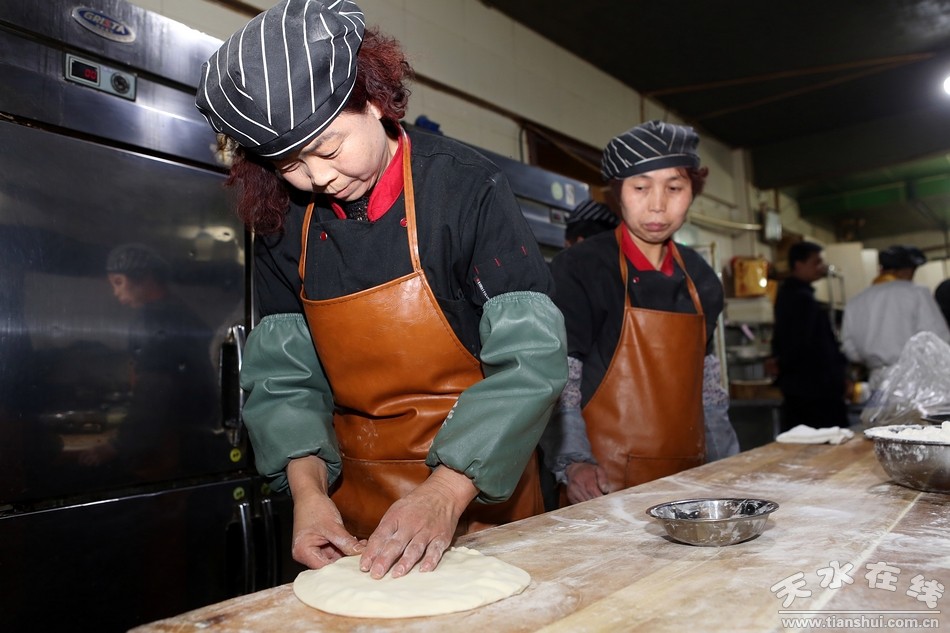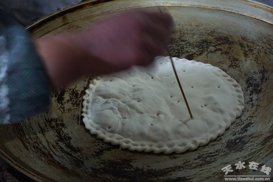 這邊熱氣騰騰的麻腐剛出鍋,那邊已經(jīng)和好面準(zhǔn)備放餡料了。只見(jiàn)幾個(gè)女廚師飛快的把面團(tuán)搟成兩張薄面片,一張放在案板上,將炒好的餡料呈圓形均勻地抹在上面,另一張蓋在餡料上,壓邊捏花。緊接著就是烙餅了,將麻腐餅扎上小孔放入預(yù)熱好的電餅鐺里,用200度以上的火烙五分鐘左右,等底面烙熟泛黃后,將其翻面,待麻腐餅兩面微黃而不焦即可出鍋。