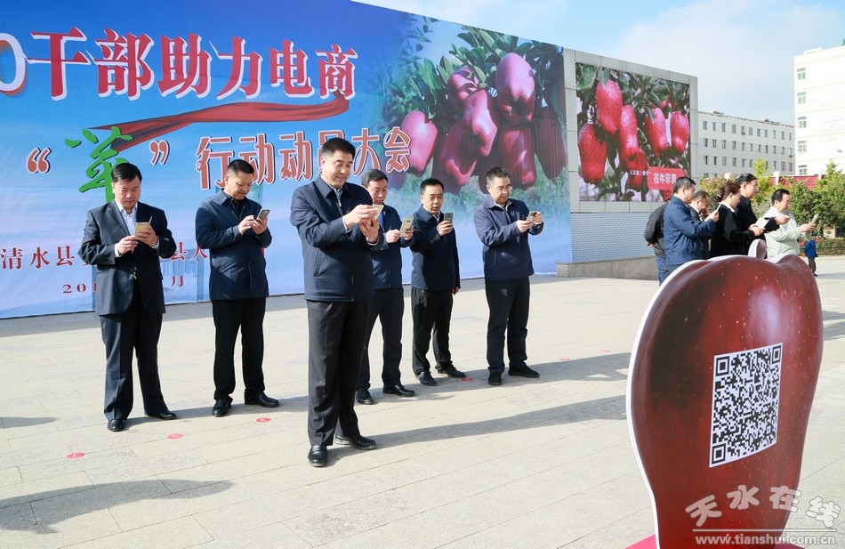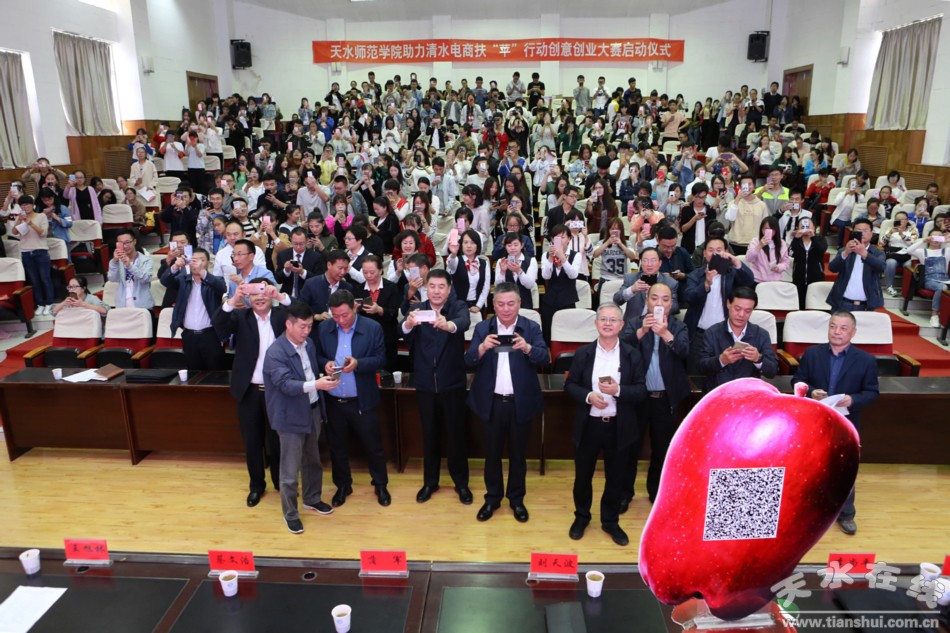 (天水市委常委、宣傳部長(zhǎng)蒲軍,天水師范學(xué)院校長(zhǎng)蔡文浩,天水師范學(xué)院副校長(zhǎng)王旭林,市人大常委會(huì)副主任、清水縣縣委書記劉天波,市委副秘書長(zhǎng)、機(jī)要局局長(zhǎng)于旭峰,市政府副秘書長(zhǎng)焦新德,市商務(wù)局局長(zhǎng)李尚平,清水縣委副書記、縣長(zhǎng)馬越垠,甘肅銀行天水分行行長(zhǎng)陳金輝,天水師范學(xué)院黨委常委、組織部長(zhǎng)馬超,天水師范學(xué)院黨委常委、宣傳部長(zhǎng)汪詠國,清水縣委常委、統(tǒng)戰(zhàn)部長(zhǎng)李振,縣委常委、宣傳部長(zhǎng)盧芳,副縣長(zhǎng)王懷珍, 天水在線負(fù)責(zé)人,清水縣縣直有關(guān)部門、天水師范學(xué)院有關(guān)處室及二級(jí)學(xué)院的領(lǐng)導(dǎo)及學(xué)生近400人,現(xiàn)場(chǎng)掃描二維碼,啟動(dòng)”天水師范學(xué)院助力清水電商扶‘蘋’行動(dòng),在微信朋友圈宣傳本次活動(dòng),推介清水果農(nóng)微信直銷花牛蘋果二維碼。)