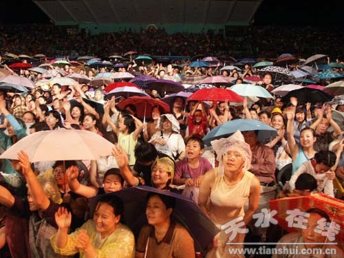 ▲2003年的節(jié)會(huì)為期4天,每天安排了一個(gè)高潮活動(dòng)。第一天是節(jié)會(huì)開(kāi)幕式,第二天是公祭伏羲大典,第三天是焰火晚會(huì),第四天是明星演唱會(huì)。 這是天水在線當(dāng)時(shí)網(wǎng)絡(luò)直播時(shí)發(fā)布的明星演唱會(huì)的圖片。