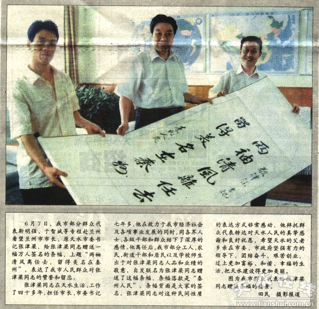 6月7日,我市部分群眾代表靳明強、于智斌等專程赴蘭州看望蘭州市市長、原天水市委書記張津梁,給張津梁同志贈送一幅萬人簽名的條幅,上題“兩袖清風離任去,留得美名在秦州”,表達了我市人民群眾對張津梁同志的贊譽和留戀。