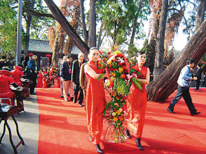 上午9時,天水伏羲廟莊嚴(yán)肅穆,伴隨著祭祀音樂的響起,參加祭拜活動的來賓全體肅立,張懷西宣布公祭儀式開始。擊鼓鳴鐘之后,饒穎奇代表臺灣同胞恭讀祭文:“兩岸同胞,攜手而行;瞻望前路,民族復(fù)興……”隨后,張懷西、饒穎奇、張文彬和香港中文大學(xué)中文系教授黃坤堯向伏羲敬獻(xiàn)了花籃,其他參祭人員依次步入先天殿,向伏羲圣像行三鞠躬禮。