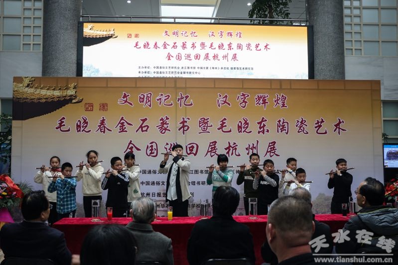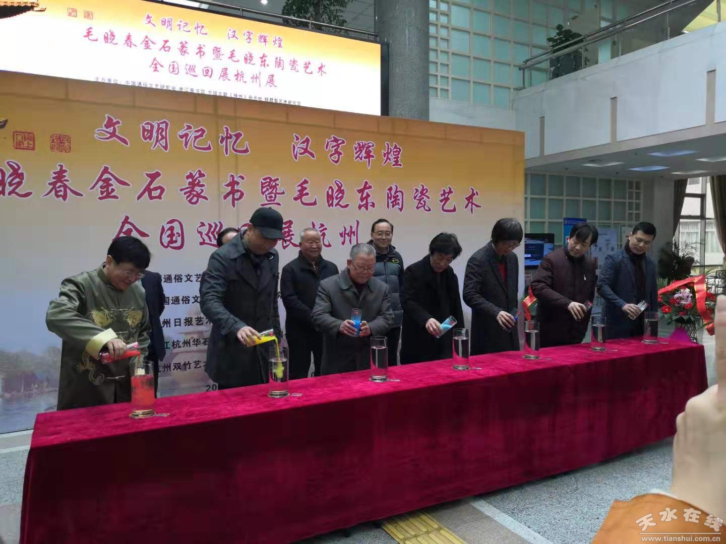 3月9日上午10時(shí),隨著悠揚(yáng)的古琴聲,七種繪畫(huà)基本色彩顏料被現(xiàn)場(chǎng)嘉賓緩緩倒入到盛滿清水的玻璃瓶中,被譽(yù)為“金錯(cuò)書(shū)”第一人,著名作家、學(xué)者、金石書(shū)法家毛曉春及陶瓷藝術(shù)家毛曉東“文明記憶、漢字輝煌”金石篆書(shū)暨毛曉東陶瓷藝術(shù)全國(guó)巡回展杭州展在杭州浙江圖書(shū)館開(kāi)幕。