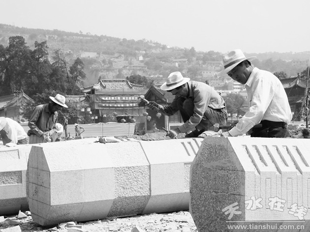 (工人在建設(shè)中的伏羲祭祀廣場(chǎng)精心施工)