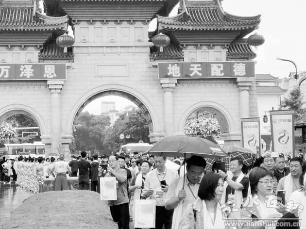 (參加伏羲文化旅游節(jié)的國(guó)內(nèi)外來(lái)賓步入伏羲城)