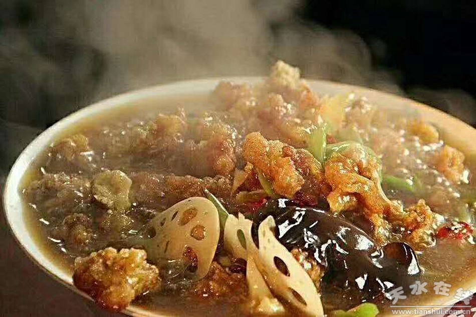 這里順便說說天水的另一道菜,當(dāng)然和酸辣里脊有點(diǎn)關(guān)系,或者說它就是酸辣里脊的姐妹篇,它就是糖醋里脊。前面說了,酸辣里脊代表了天水這座西北內(nèi)陸城市的地理特征,而糖醋里脊呢,和酸辣里脊一樣,也代表了天水的另一種地理特征——天水雖在隴上,但氣候濕潤,有江南之味——所以說,糖醋里脊代表的是天水的江南氣質(zhì)。但為什么糖醋里脊不在天水飲食的老三篇之列呢,我想,盡管天水有“隴上小江南”之稱,但畢竟還在隴上,其江南色彩肯定不是主流文化,所以老三篇里也就不會(huì)有它的影子。
