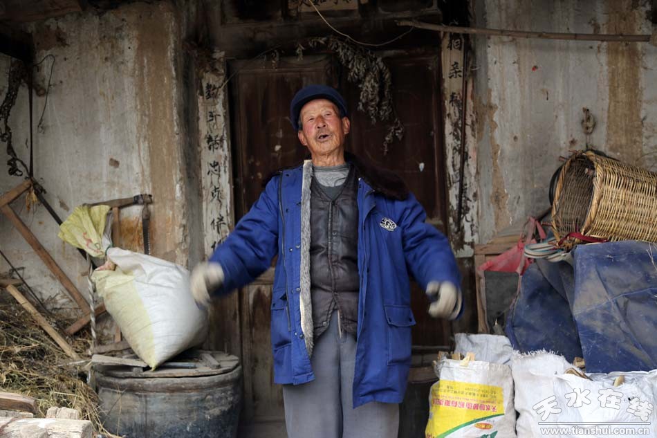 老人的宅子并不大,是典型的天水當?shù)貍鹘y(tǒng)農(nóng)家四合院落。主房是近年新修的,倒是門前栽植的兩株黃楊樹有些樹齡了。主房的西邊便是老人引以為豪的老房子。這座房子的確有一定的歷史,土坯青瓦,深廊出檐,簡樸而寧靜,悠久而親切。房子雖已破舊,但仍不失當年的氣派,無不滲透著歷史的滄桑,見證著村子的古老和曾經(jīng)的輝煌。