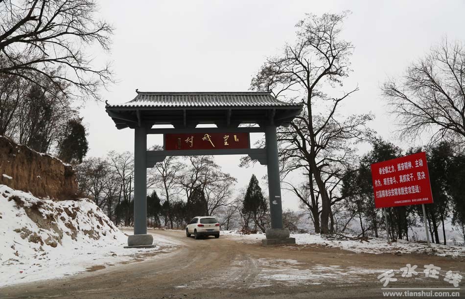 從城中出發(fā),驅車沿北山公路不到十里的路程便到山梁口,在公路左側,一座莊嚴古樸的村牌門耀入眼簾。中國原道教協(xié)會會長任法融題寫的“皇城村”三個金色大字熠熠生輝,筆體蒼勁俊朗,透露出皇家之氣,為大雪覆蓋的山村平添了一份莊嚴和肅穆。站在村牌門口遠眺,群山起伏,白雪皚皚,渭水環(huán)繞,氣象萬千,無不預示著這個靜躺千年古老山村的神奇和迥異。