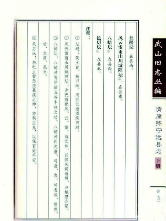 《清康熙寧遠(yuǎn)縣志》也有記載:“風(fēng)云雷雨山川城隍壇,在縣東。古代祭祀風(fēng)、云、雷、雨之神,以保風(fēng)調(diào)雨順,與城隍合祭!薄帮L(fēng)云雷雨壇”:“在城東郊外,祭用春秋二仲上巳日,設(shè)三壇,風(fēng)云雷雨居中,山川居左,城隍居右,陳設(shè)與社稷同,城隍廟與風(fēng)云雷雨壇合祭!