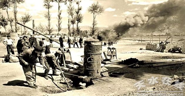 操場上,幾天時間,幾座高不過三米,直徑一米多左右,圓錐體形狀,用廢舊耐合磚砌筑而成土法煉鐵爐矗立起來。爐腔內用耐和土抹壁,爐體下方安裝的鼓風機,用于向爐內吹風加熱。爐體上方煙筒用于排煙,爐下方一個小溜槽,供出鐵。那些日子真是熱鬧極了。白天黑夜,煉鐵爐冒著黑煙,整個操場黑煙滾滾,熱浪沖天,晚上,操場上空紅彤彤一片,將天空映照得通紅通亮。操場里人聲鼎佛,忙忙亂亂的在為“鋼鐵元帥升帳”而忙祿。