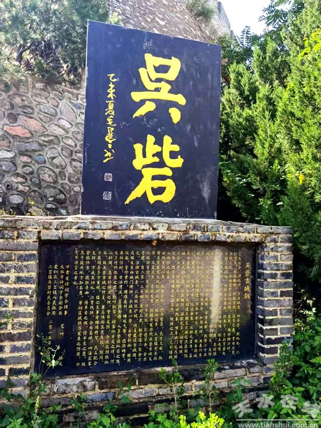 吳砦古城位于甘陜交界渭河南岸,處于渭河天寶間三岔之咽喚,是古代兵家必爭(zhēng)要塞。仰望城門,高聳入云,眾友拾級(jí)而上,天水籍著名書法家毛選選先生揮毫?xí)鴮懙摹皡琼巍眱勺,鐫刻在一塊巨石上,遒勁顏體,引人注目。天水著名詩(shī)人艾葉撰寫的《吳砦古城敘》也鐫刻在其下方。其《敘》曰:“天寶之會(huì)、渭之濱,有古城焉,曰吳砦”。雄據(jù)“北控渭水,南扼蜀道”之要沖,“秦關(guān)百二,隴塞三千”,乃兵家必爭(zhēng),亦為商旅通衢。南來(lái)北往,東水馬龍,喧囂勝景,其皆浸透于字里行間,今日細(xì)細(xì)品讀之,其繁榮盛況浮現(xiàn)于眼前。