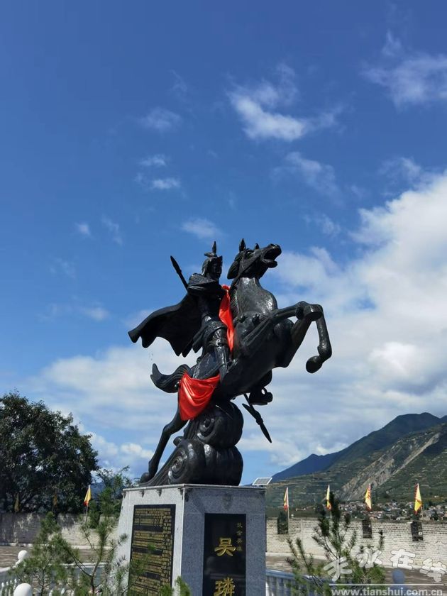 站在城樓上,極目遠(yuǎn)眺,只見(jiàn)峰巒疊嶂,渭河橫貫甘陜向東奔涌,波光粼粼宛如銀色綢帶,蔚為壯觀。秋風(fēng)吹拂,城墻上的小旗飄揚(yáng),發(fā)出獵獵的聲響,磚石錯(cuò)落有致,縫隙間長(zhǎng)滿了花草,撫摸著斑駁的磚墻,仿佛能感受到吳璘帶領(lǐng)士兵筑城時(shí)的堅(jiān)毅,以及無(wú)數(shù)守城將士的熱血與堅(jiān)守。860年前,吳璘(1102年至1167年)字唐卿,德順軍隴干縣(今甘肅靜寧人)。他為了抗擊金兵,保衛(wèi)南宋,勘察渭河南界高地修建城池,作為西北防線重要據(jù)點(diǎn),多次屢敗金軍,為保衛(wèi)秦隴屏障巴蜀立下了汗馬功勞!敖鸨^(guò)不了鐵門檻”的傳說(shuō)由此流傳至今。吳砦人銘記抗金英雄吳璘,一代一代傾訴吳璘抗擊金兵的悲壯故事。大家一商議,要雕塑吳璘像一座,消息傳出,吳砦人紛紛響應(yīng),不論是在外地工作的人,還是打工謀生的鄉(xiāng)鄰都不甘落后,慷慨解囊,短短幾天時(shí)間,就收到捐款資金數(shù)十萬(wàn)元。他們聘請(qǐng)能工巧匠,連續(xù)奮戰(zhàn)數(shù)月,在古城中心地帶矗立起一座吳璘雕像,并命名為吳璘廣場(chǎng),成為吳砦人永遠(yuǎn)銘記英雄名將的標(biāo)志。穿行雕花“三岔鎮(zhèn)”牌坊門,步入廣場(chǎng)正中央。吳璘雕像映入眼簾:吳璘頭戴兜鍪,身著鎧甲,右手持長(zhǎng)矛端坐于馬上,兩眼炯炯,凝視東方,呈帷幄運(yùn)籌之勢(shì),更顯英雄之豪邁,縱千萬(wàn)年之后令人敬仰。