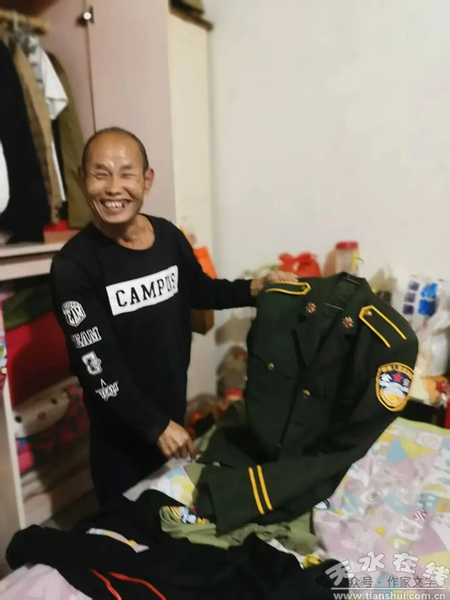 屋里靜悄悄,電視閃著——一場足球賽正播著。他已上床靠著枕頭,神色疲憊。見我來了忙示意坐床沿。我問怎么睡這樣早,他指指自己的頭。許是染了風(fēng)寒。屋子收拾得倒還利落。他高興起來,從床頭筐子里摸出紅得透亮的甜柿子塞到我手里。又翻身下床打開衣柜,鄭重取出朋友送的公安服向我展示。穿上帶肩章的外套,他挺直腰板,眼里閃光,像個得了新裝的孩子。