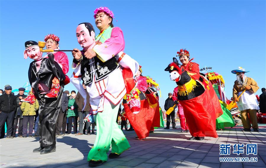 1月13日,甘肅張掖甘州區(qū)靖安鎮(zhèn)的社火表演隊(duì)在文化廣場上排練。