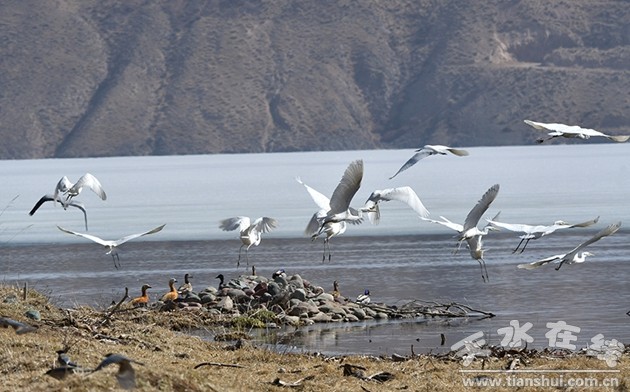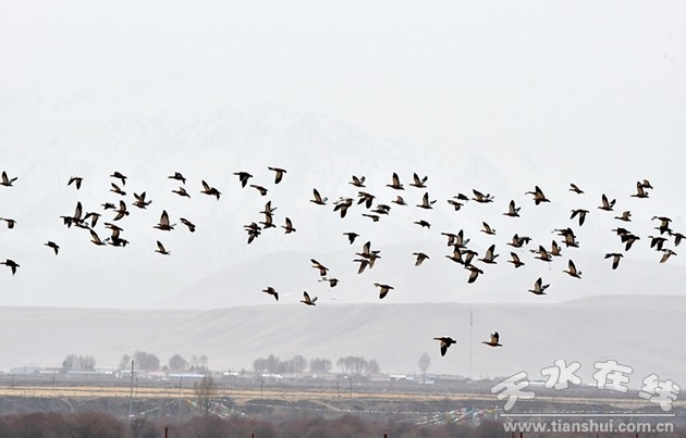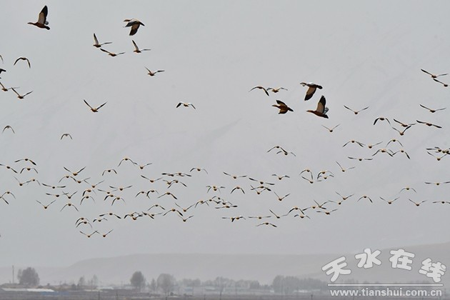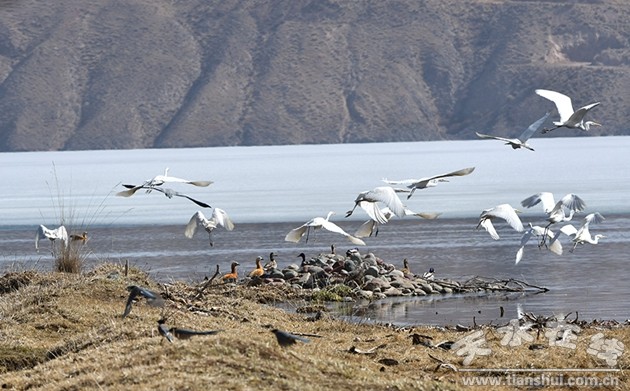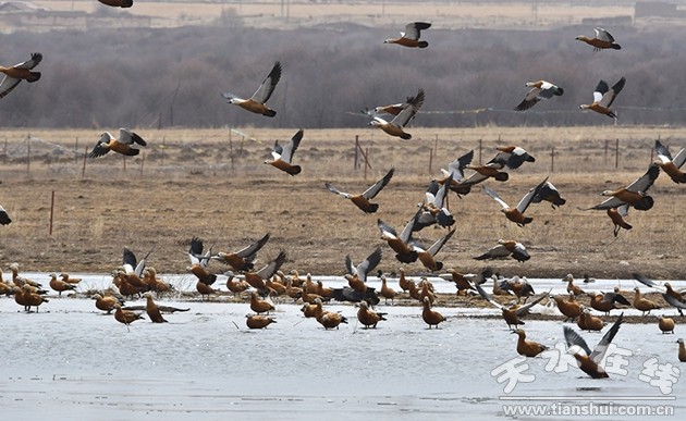 仲春四月,位于祁連山下的夏日塔拉湖、黑河、隆暢河等周邊濕地,數千只赤麻鴨、白鷺、蒼鷺、灰雁、綠頭鴨等候鳥翩然而至,在甘肅省肅南裕固族自治縣高原濕地停留棲息。據悉,祁連山是我國32個生物多樣性保護優(yōu)先區(qū)域之一,生活著黑頸鶴等206種鳥類。在這春意盎然的季節(jié)里,祁連山的鳥兒們沐春臨風,時而高聲歌唱、低聲吟哦,時而引頸振翅、翩翩起舞。(記者 武雪峰 攝)
